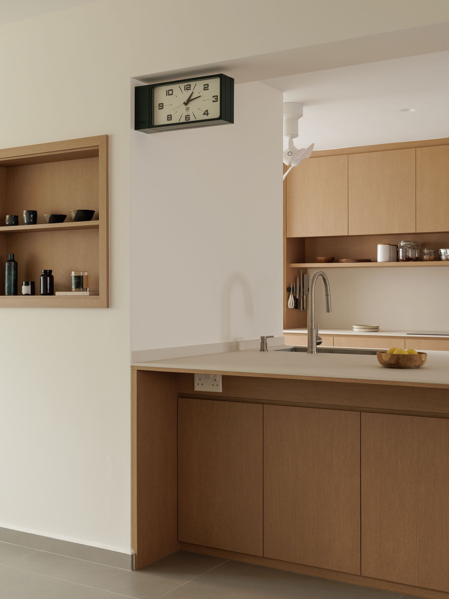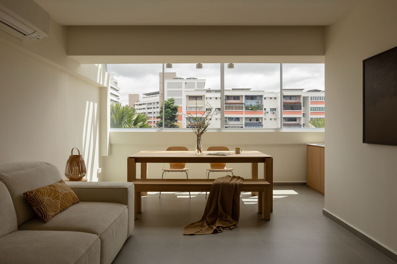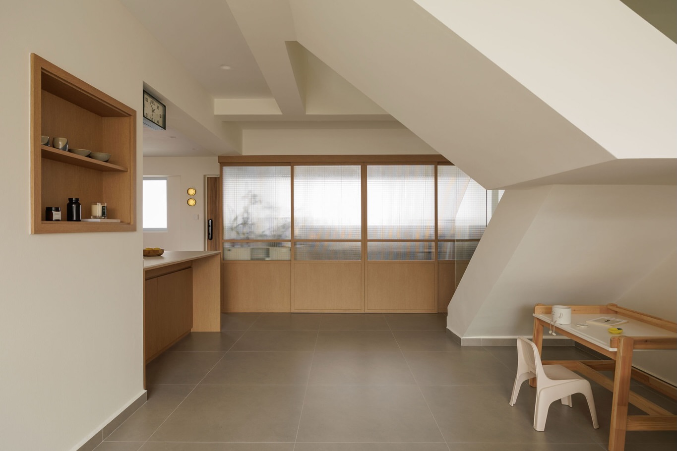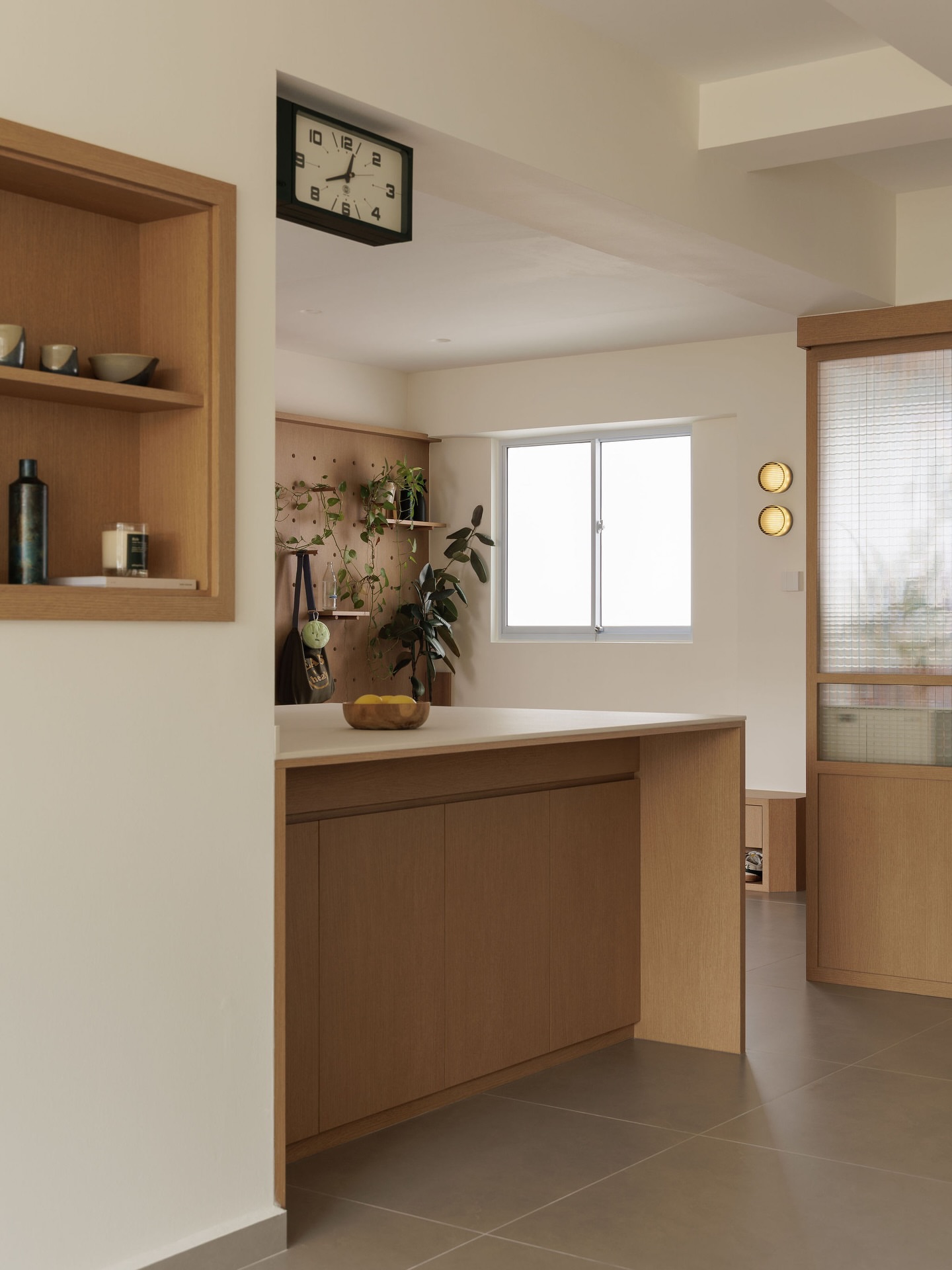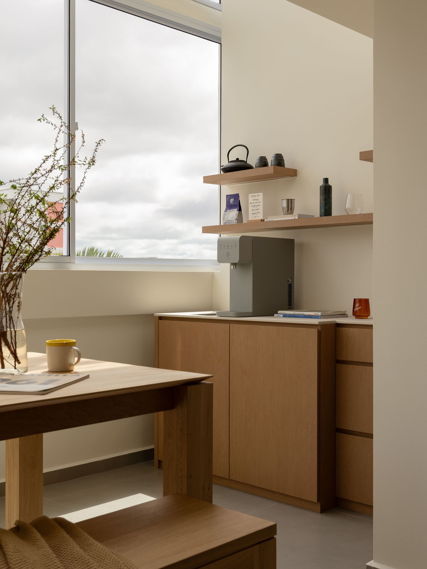 木色的桌、透明的瓶、窗外的云,都被这面墙温柔接住。没有刺眼的白,也没有沉郁的黄,它只是安静地盛着光,让每一缕风都变得柔软。